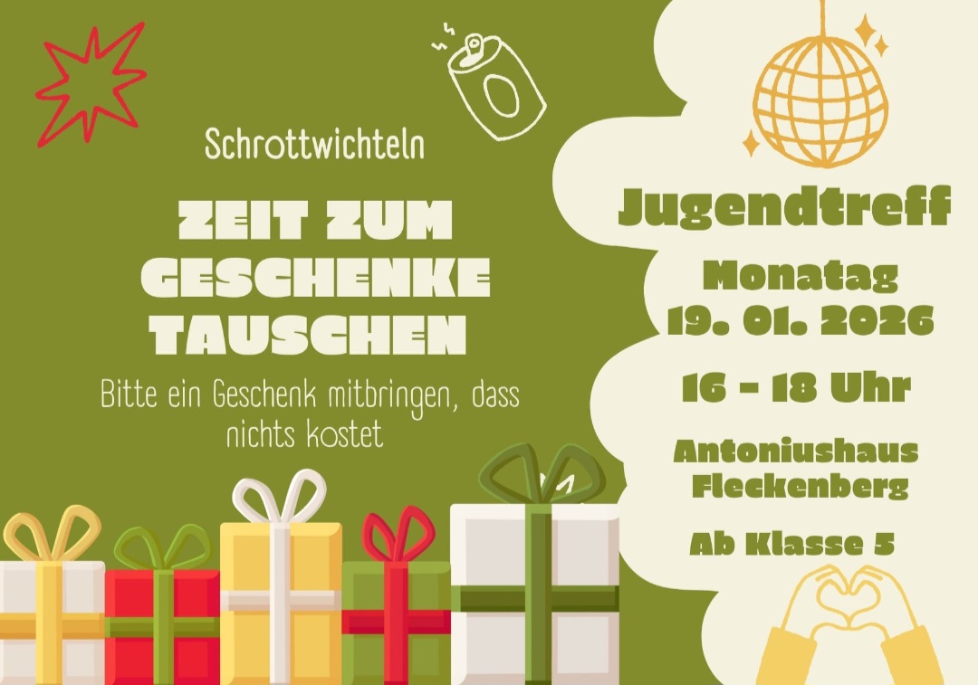 Am Montag, 19. Januar findet von 16 bis 18 Uhr der Jugendtreff im Antoniushaus für alle ab Klasse 5 statt. Wir möchten mit euch Schrottwichteln und es uns drin gemütlich…